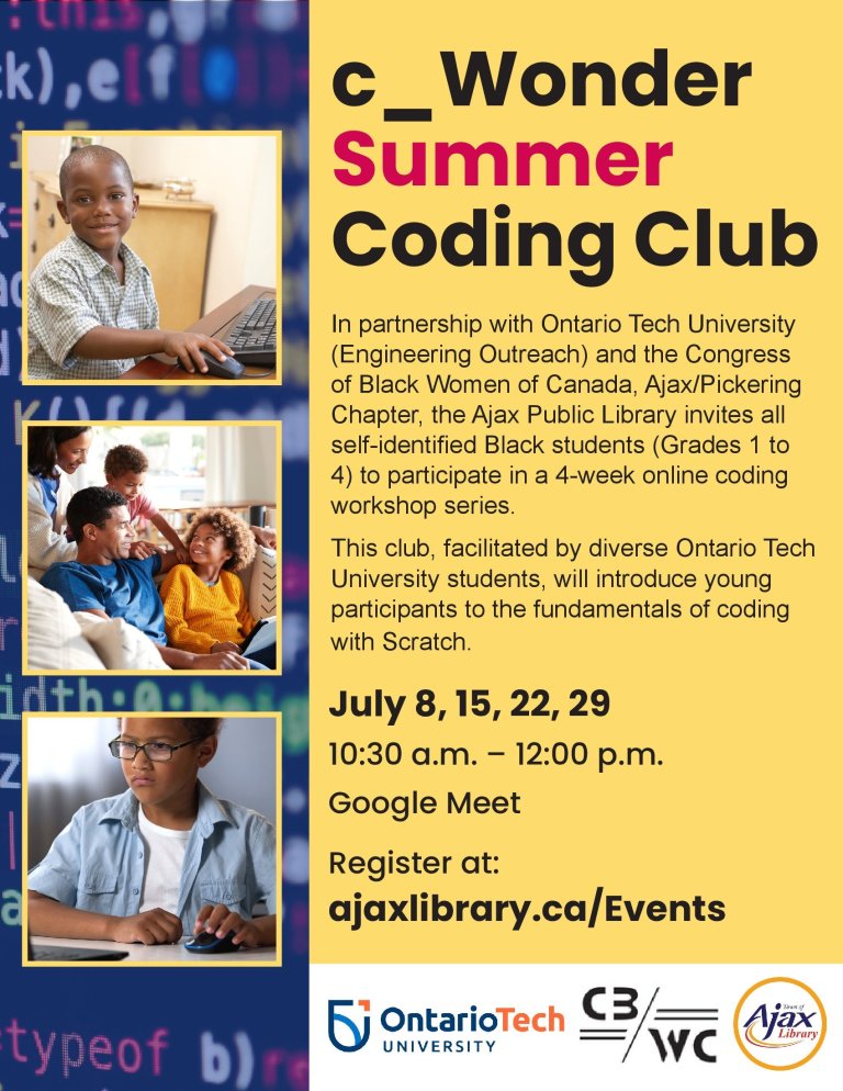 • In partnership with Ajax Public Library and led by Ontario Tech University, held a 4-week Coding Workshop introducing Grades 1 to 4 Black children to the fundamentals of coding